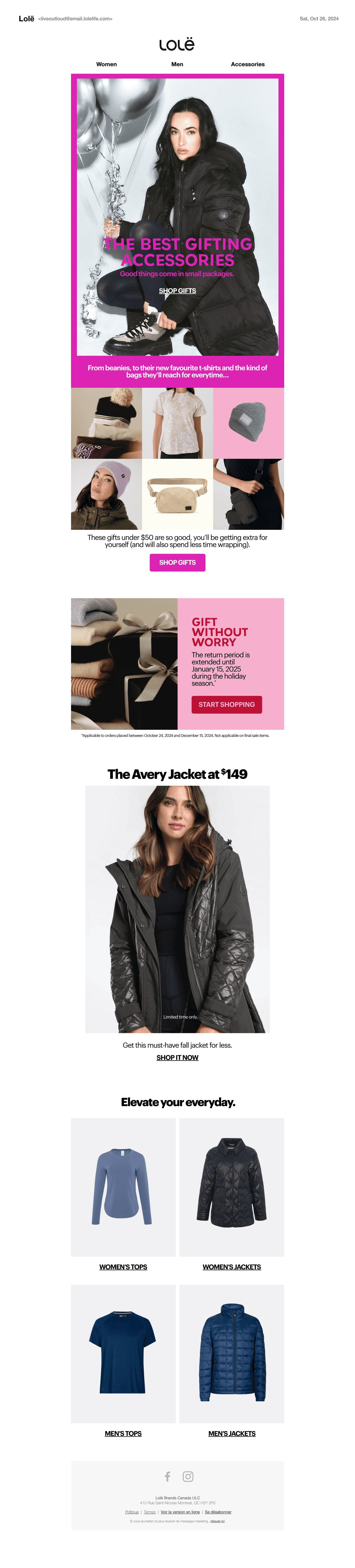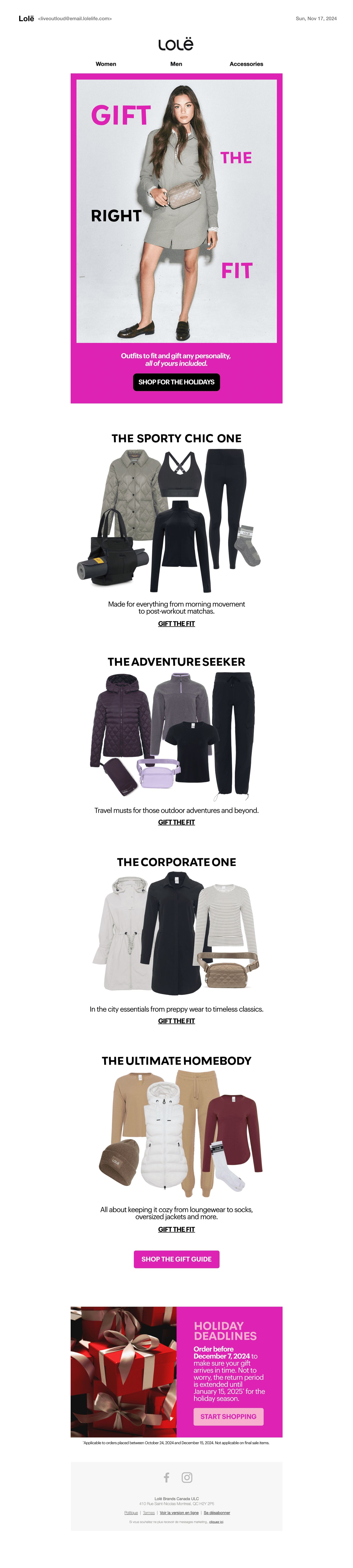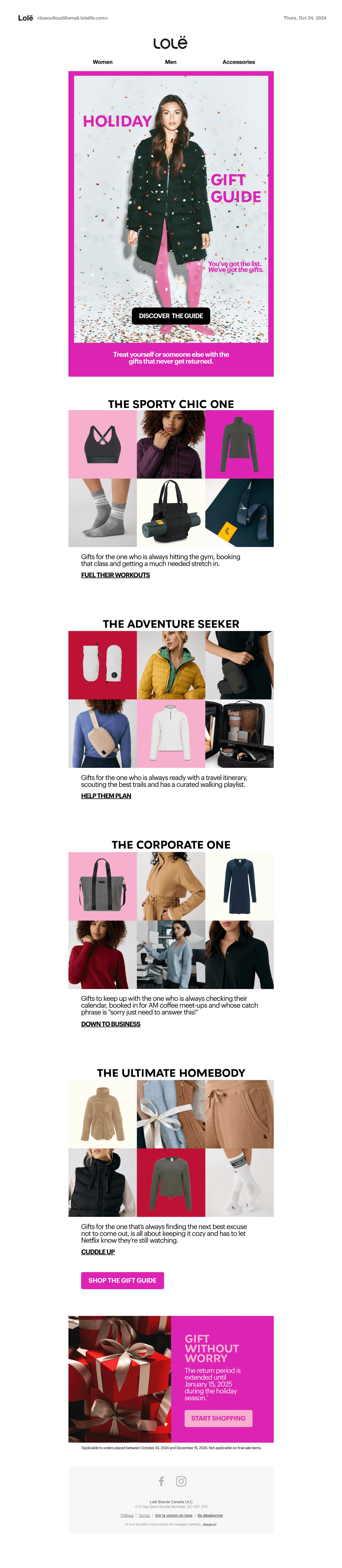 This page highlights Lolë’s Holiday 2024 collection and accompanying gift guide, designed to inspire seasonal gifting through a vibrant and expressive visual story. The creative approach balanced playfulness and warmth, elevating the holiday experience while remaining true to the brand’s active, lifestyle-driven identity.