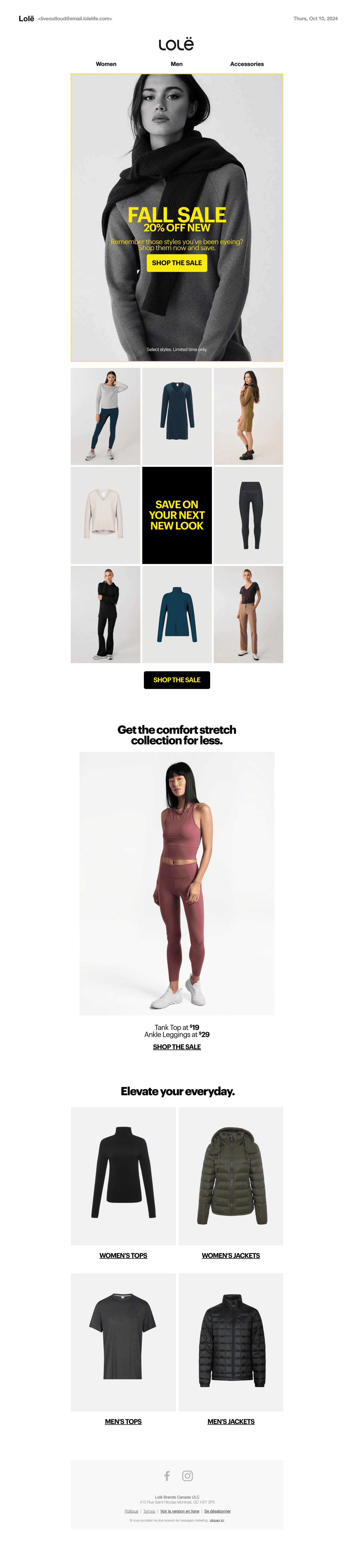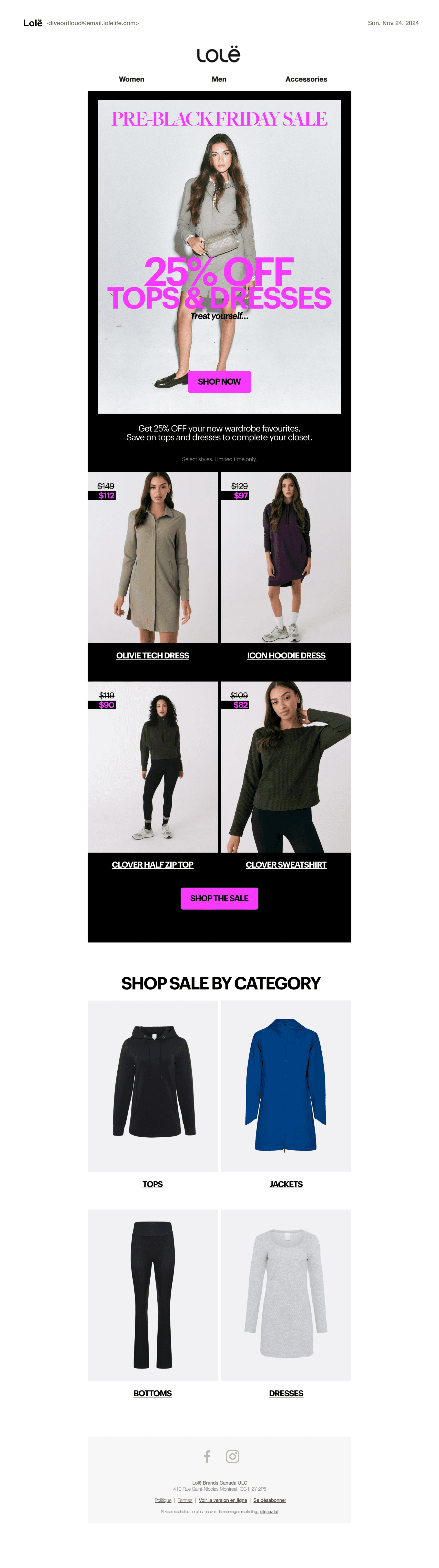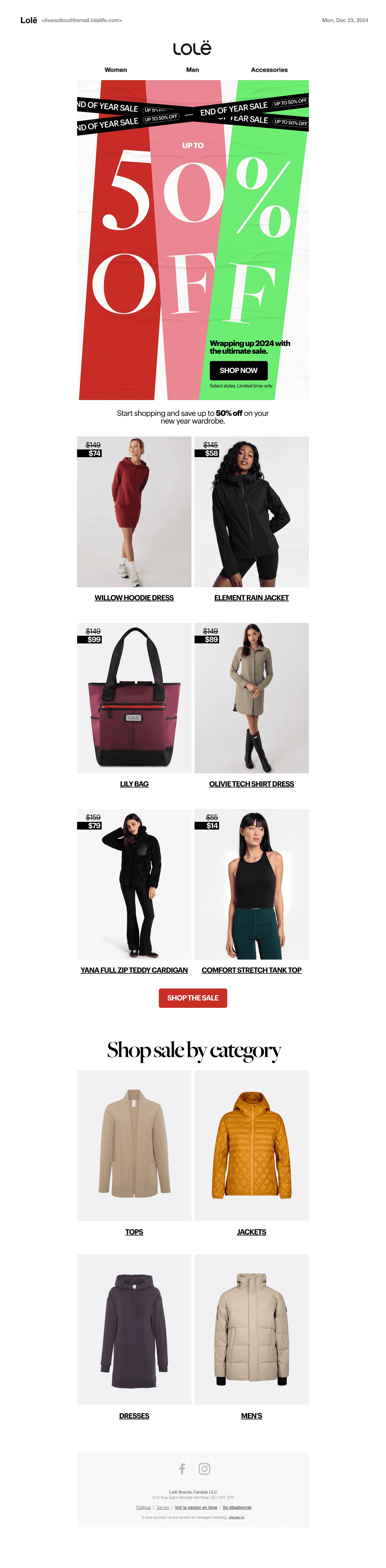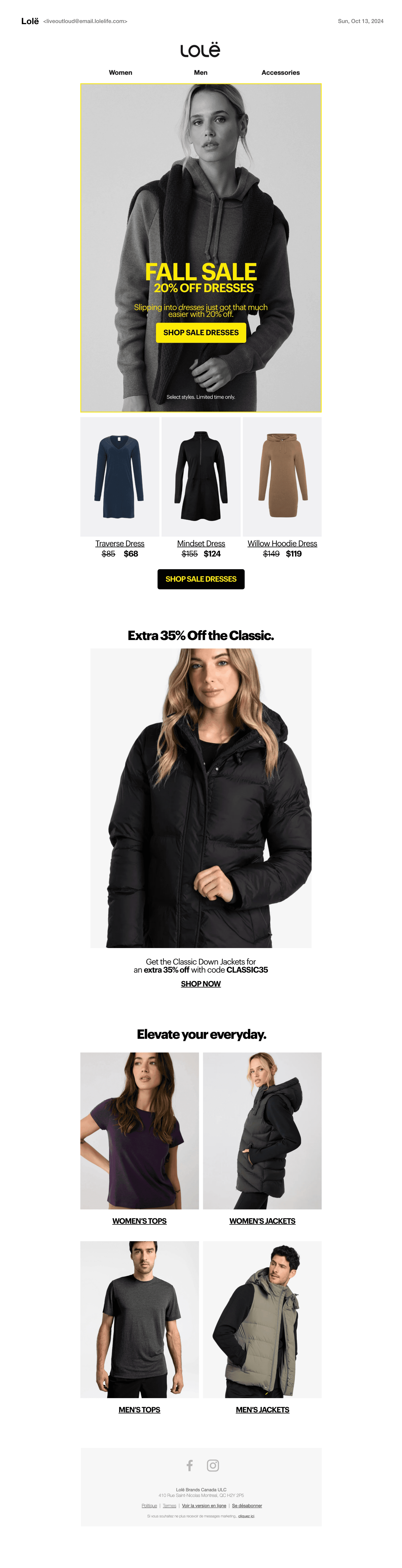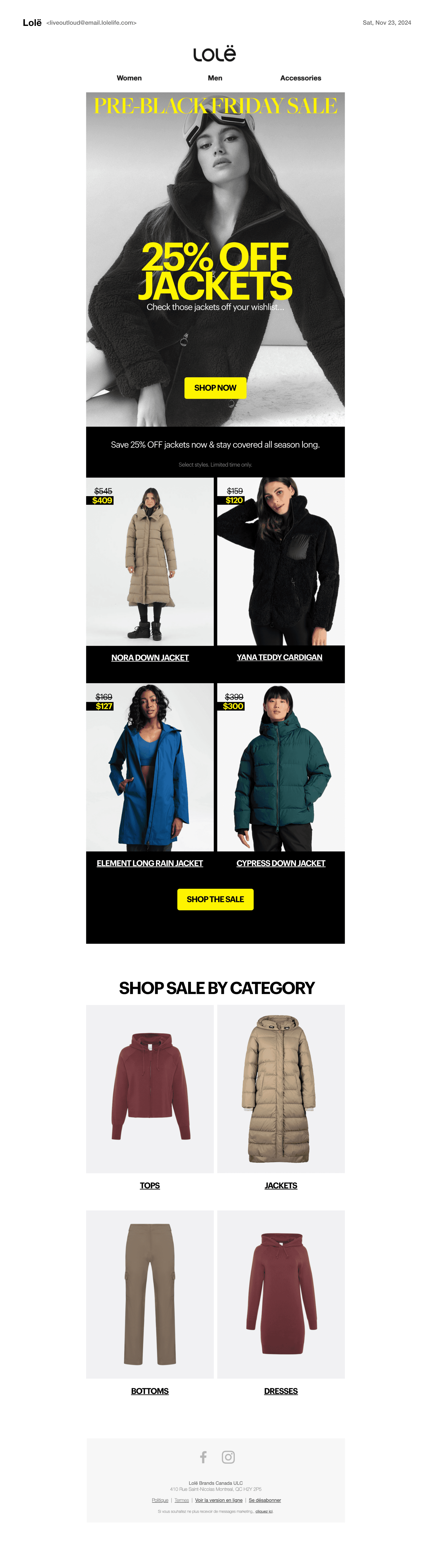 This page presents the art direction and final creative assets developed for multiple sales campaigns throughout the Fall/Winter 2024 season for Lolë. Each sale was designed with its own distinct visual identity to sustain interest and capture attention, while maintaining strong brand cohesion. Consistent brand elements, such as typography, colour palette, photography, and texture, act as connective threads across all executions. I led the marketing content, art direction, and omnichannel rollout, ensuring a cohesive and impactful presence across every touchpoint.